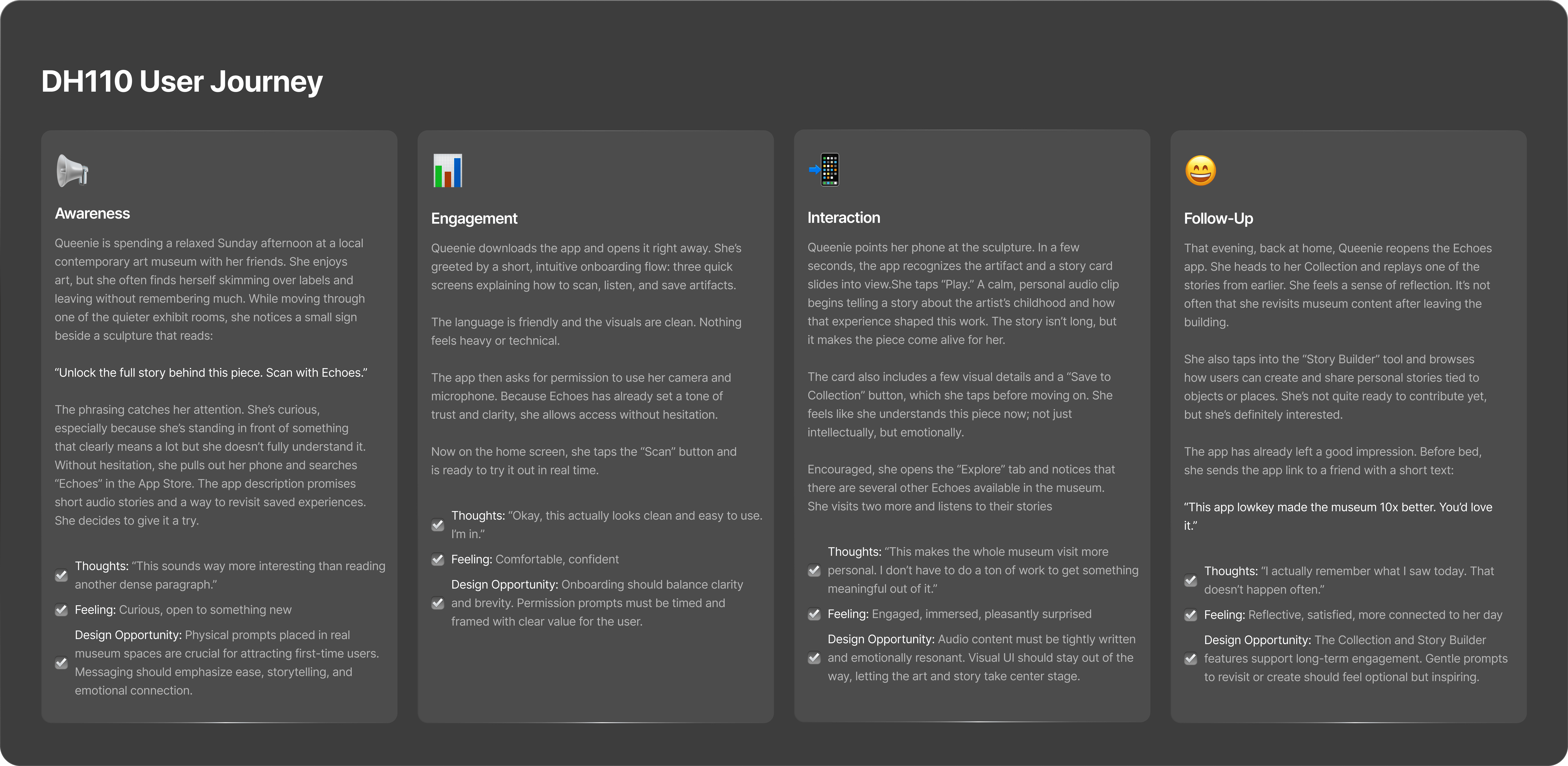 Her user need statement guided the project’s focus: “Queenie needs an app that reveals the stories and context behind artworks in a way that feels intuitive and invites her to engage further, because she wants museum visits to be memorable and personal, not passive.” I mapped out Queenie’s user journey from discovering Echoes to exploring artifacts on-site. Her journey includes onboarding, scanning a piece, listening to a short audio story, and diving deeper with contextual visuals and written details.