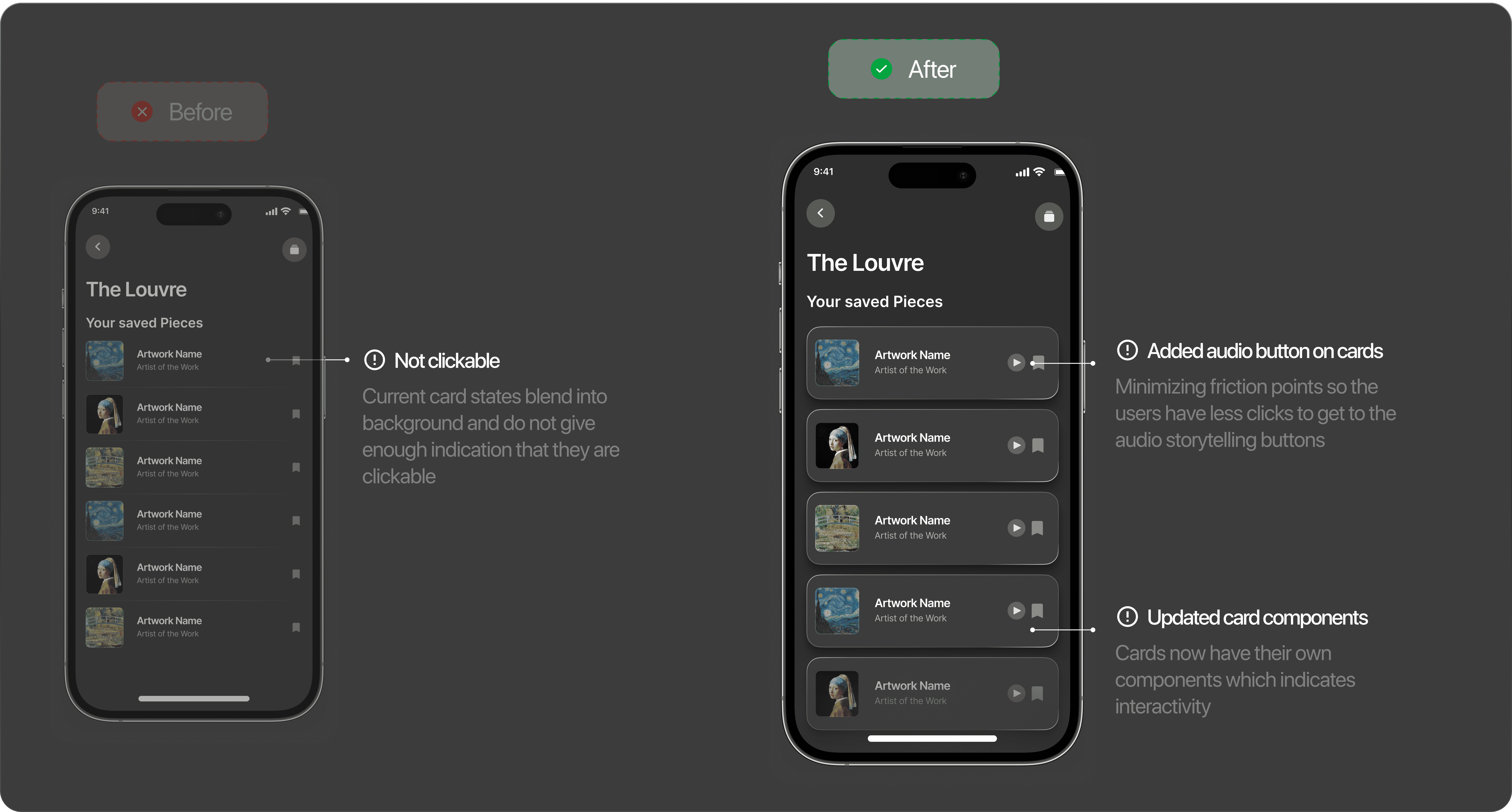 Usability testing surfaced a few critical challenges: the lack of clear affordances on scanned artifact cards, ambiguous map hotspots, and too much friction in accessing audio content. In response, I added clearer icons, hover effects, and more distinct labels. For instance, I introduced a dedicated audio play button in list views to reduce touchpoints and improve flow. This iterative process strengthened the final design by grounding it in real user expectations.
