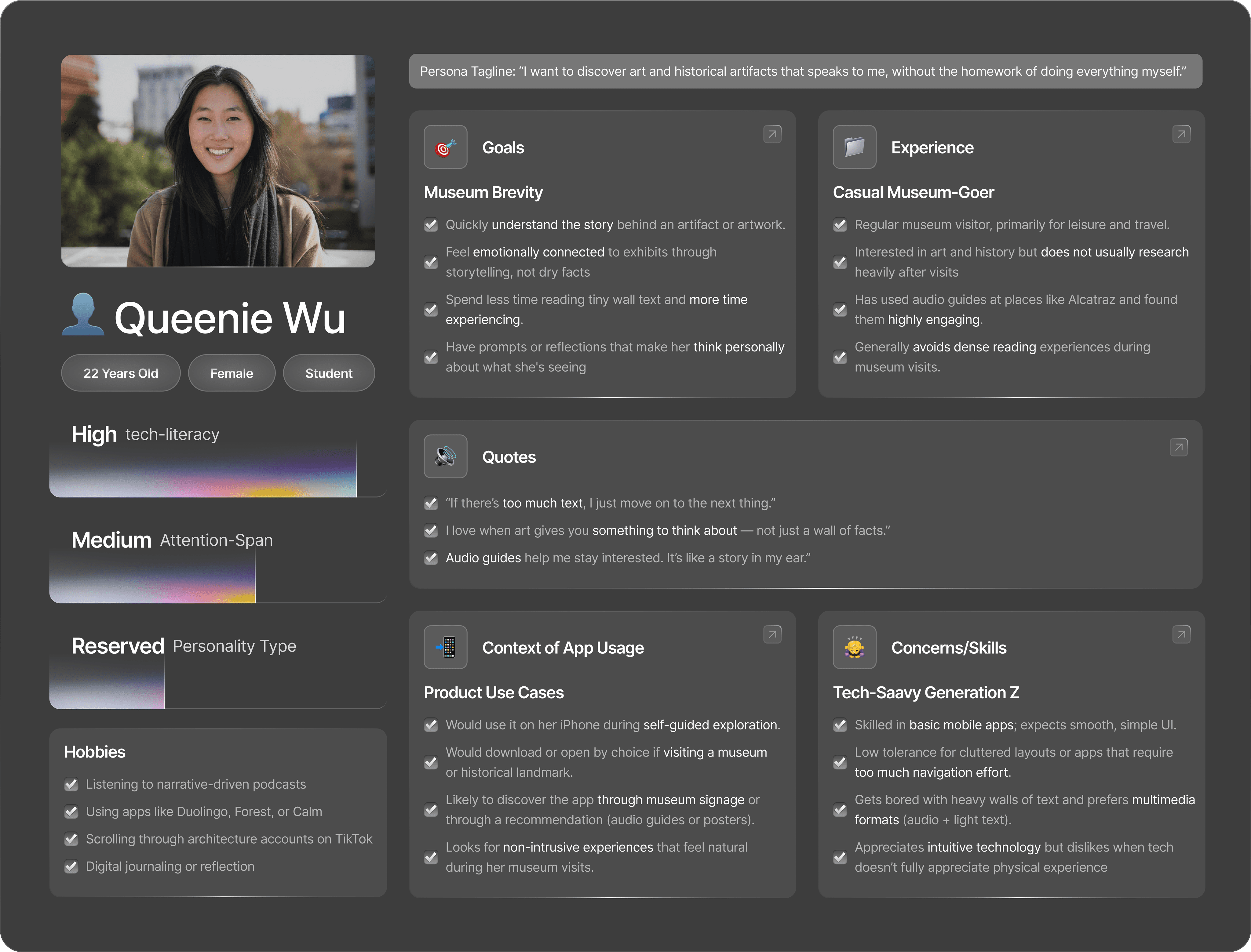 From my research, I developed a primary persona: Queenie Wu, a curious and design-conscious student who wants cultural experiences to feel both rich and accessible.