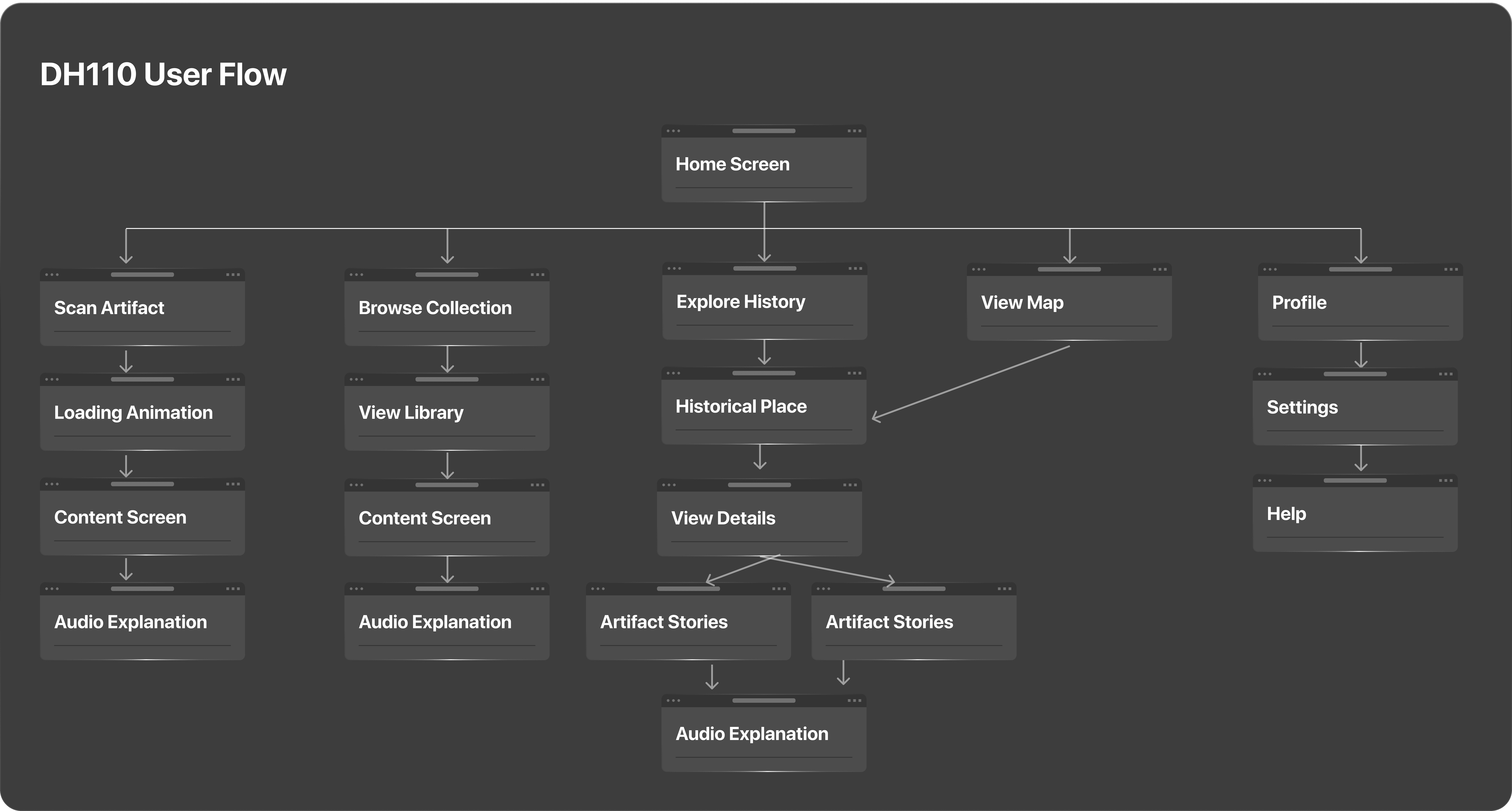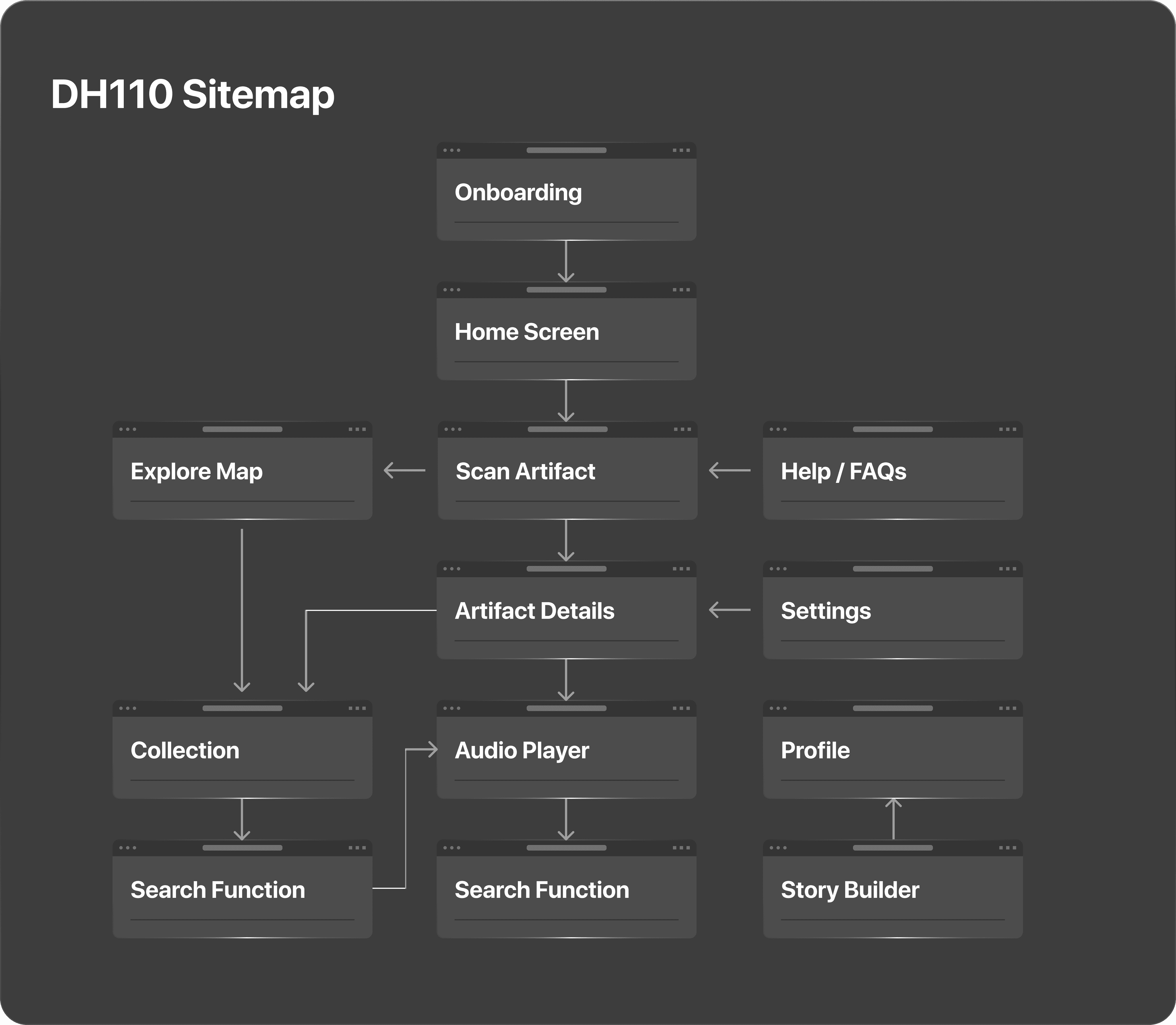 My user flow visually captured how each feature connected—highlighting the simplicity of navigating from scanning to storytelling, with seamless transitions designed to keep the focus on the artifacts themselves.